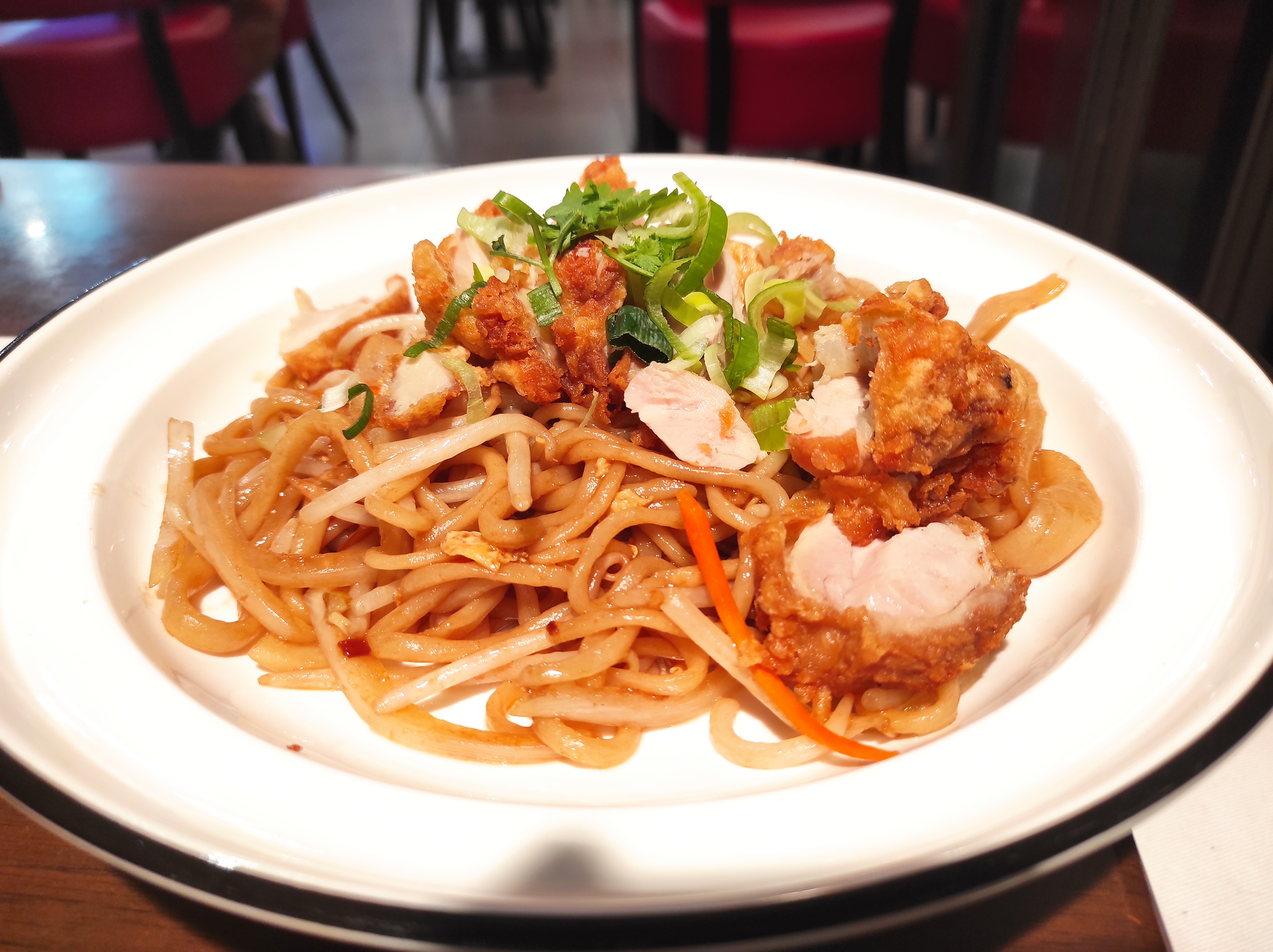 La cuisine est très bonne, bien cuite et de qualité. J'ai pris leurs nouilles sauté au polet pané et mon amie leur ramen au poulet pané avec le bouillon et tous était délicieux ! Le bouillon à un bon goût et est savoureux le poulet est moelleux et agréable avec une panure tout à fait correct. Les nouilles sautés était délicieuse, pas trop grasse avec un goût tout juste assez bien prononcé, on sent que tout est fais avec maitrise et expertise mais surtout maison ce qui est un grand plus. Le rapport qualité prix est excellent je recommande !