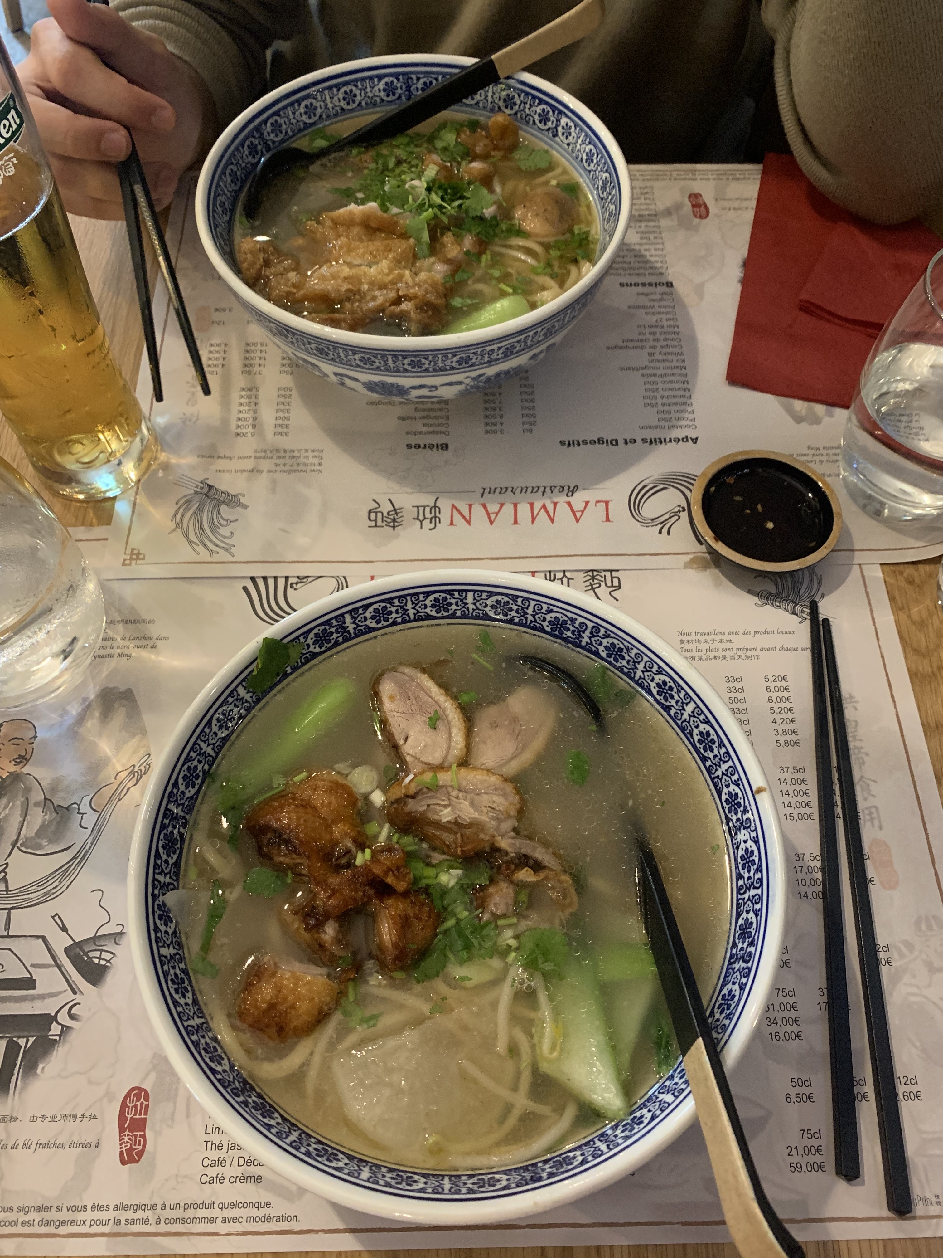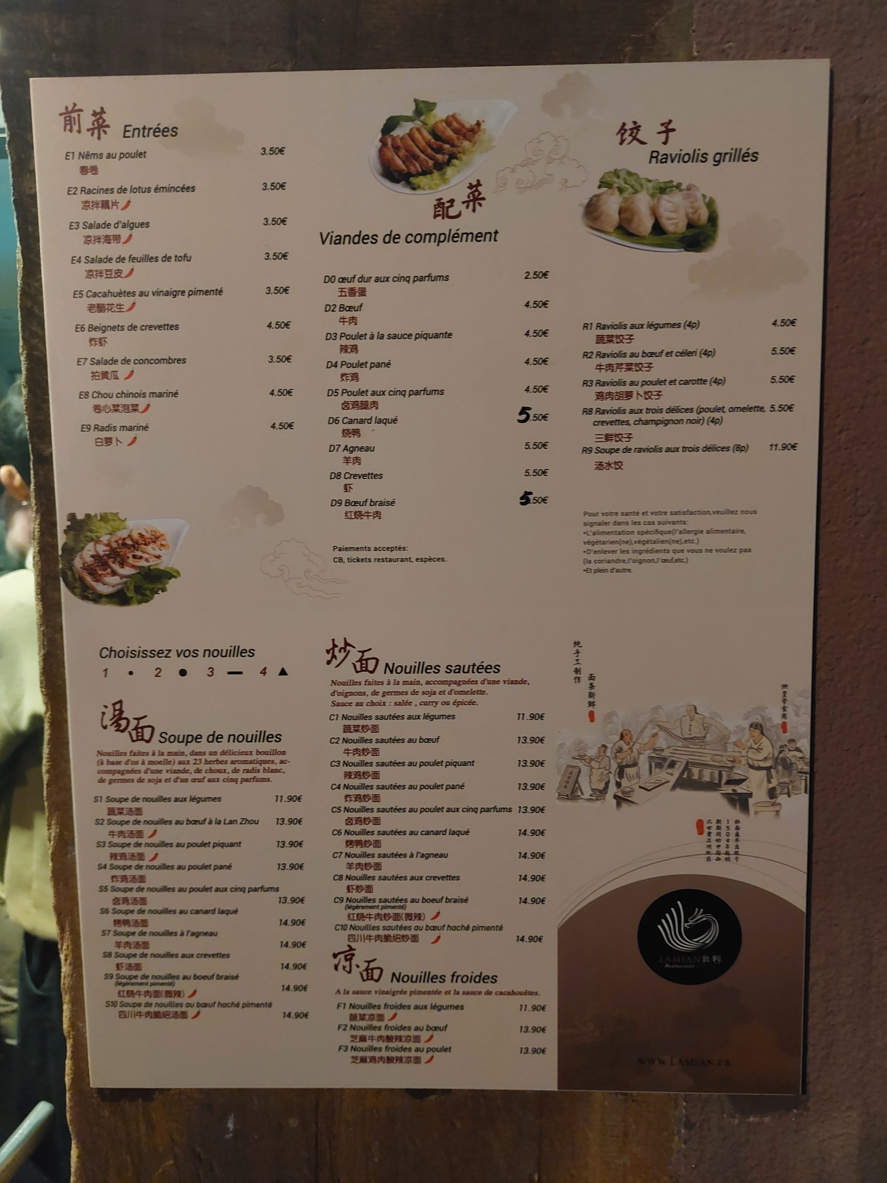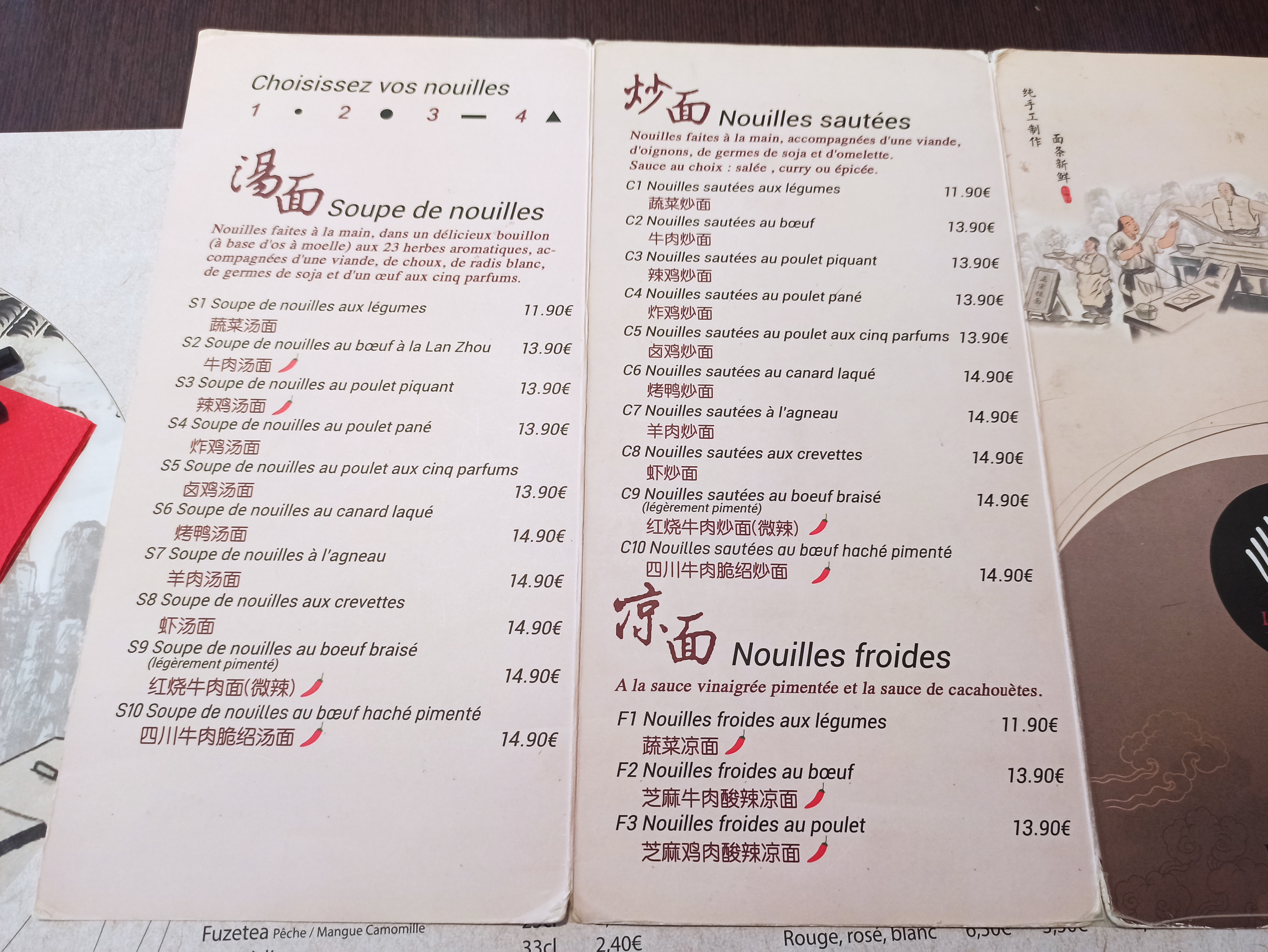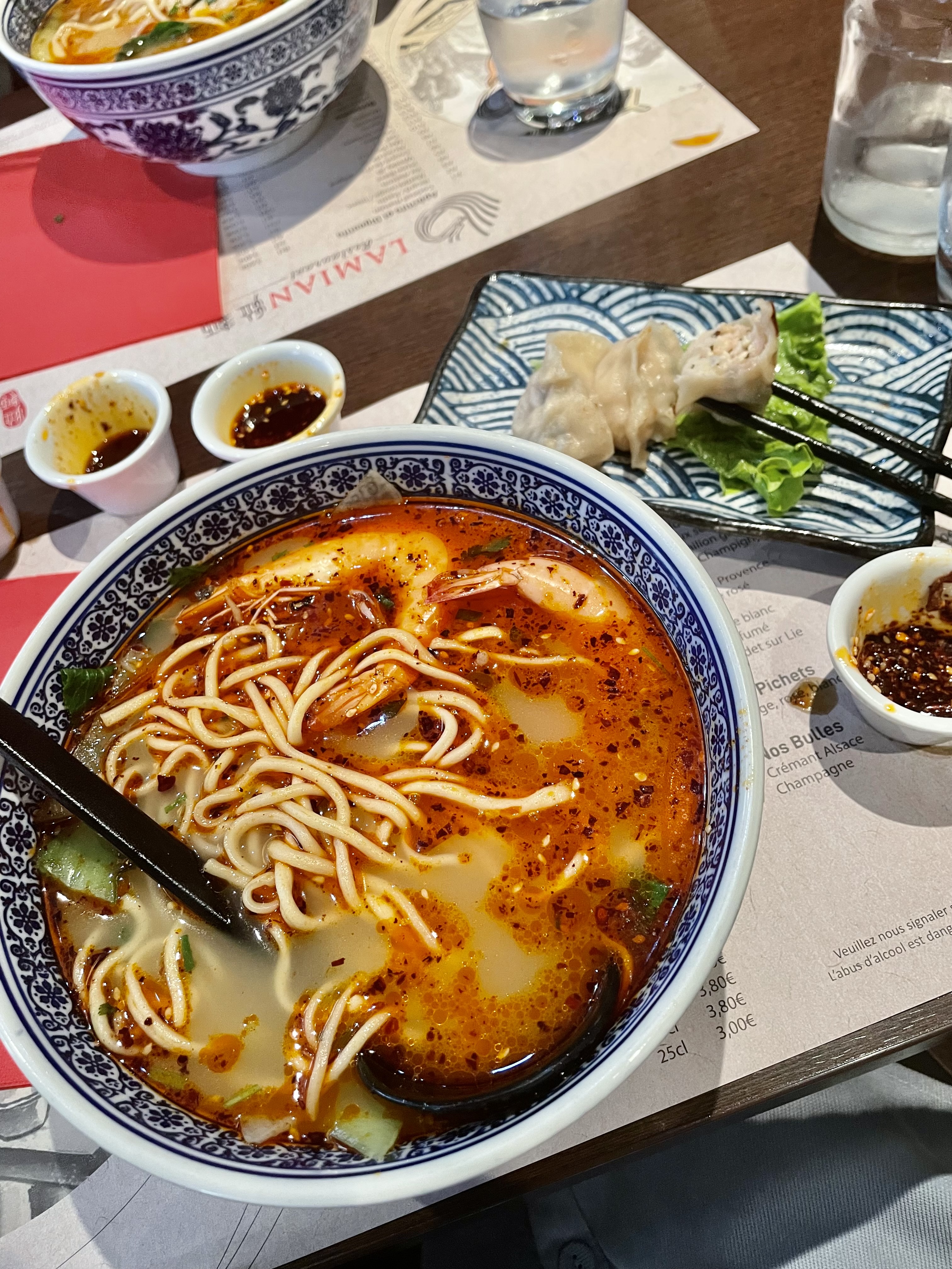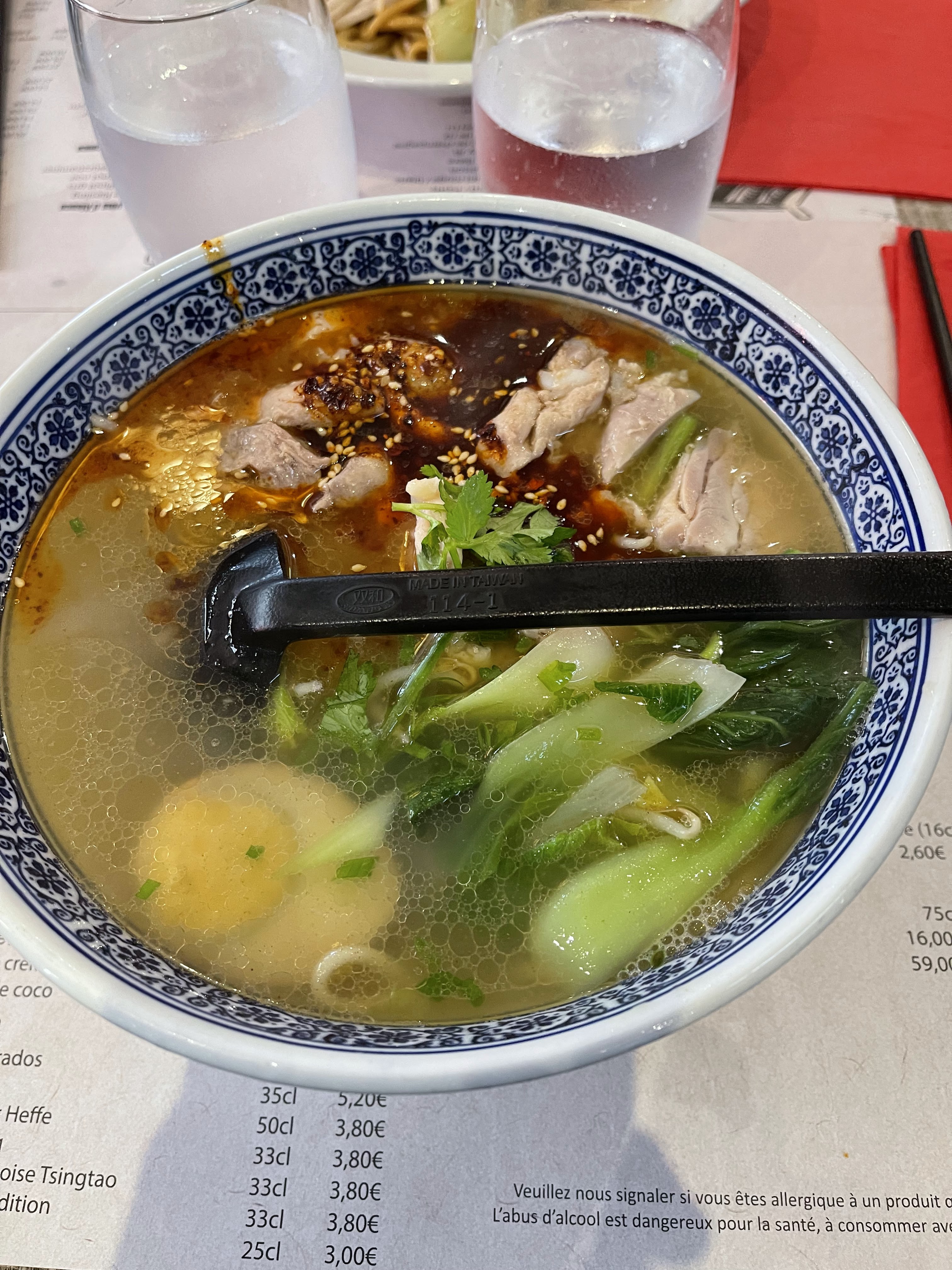 C'est un bon restaurant de nouilles chinoises. Les raviolis aussi sont bonnes avec des parfums qui sortent de l'ordinaire, comme ceux qu'on a pris (Raviolis aux trois délices). Les soupe de nouilles au poulet (soupe de nouilles de poulet pimenté et soupe de nouilles de poulet pané) sont généreuses. Le service n'est par contre pas toujours au point. Le serveur s'est trompé de boisson et j avais demandé ma soupe pimentée mais elle ne l'a pas été. Le service est un peu long par rapport à d'autres restaurants du même type (comparaison par rapport à des restaurants sur Paris).