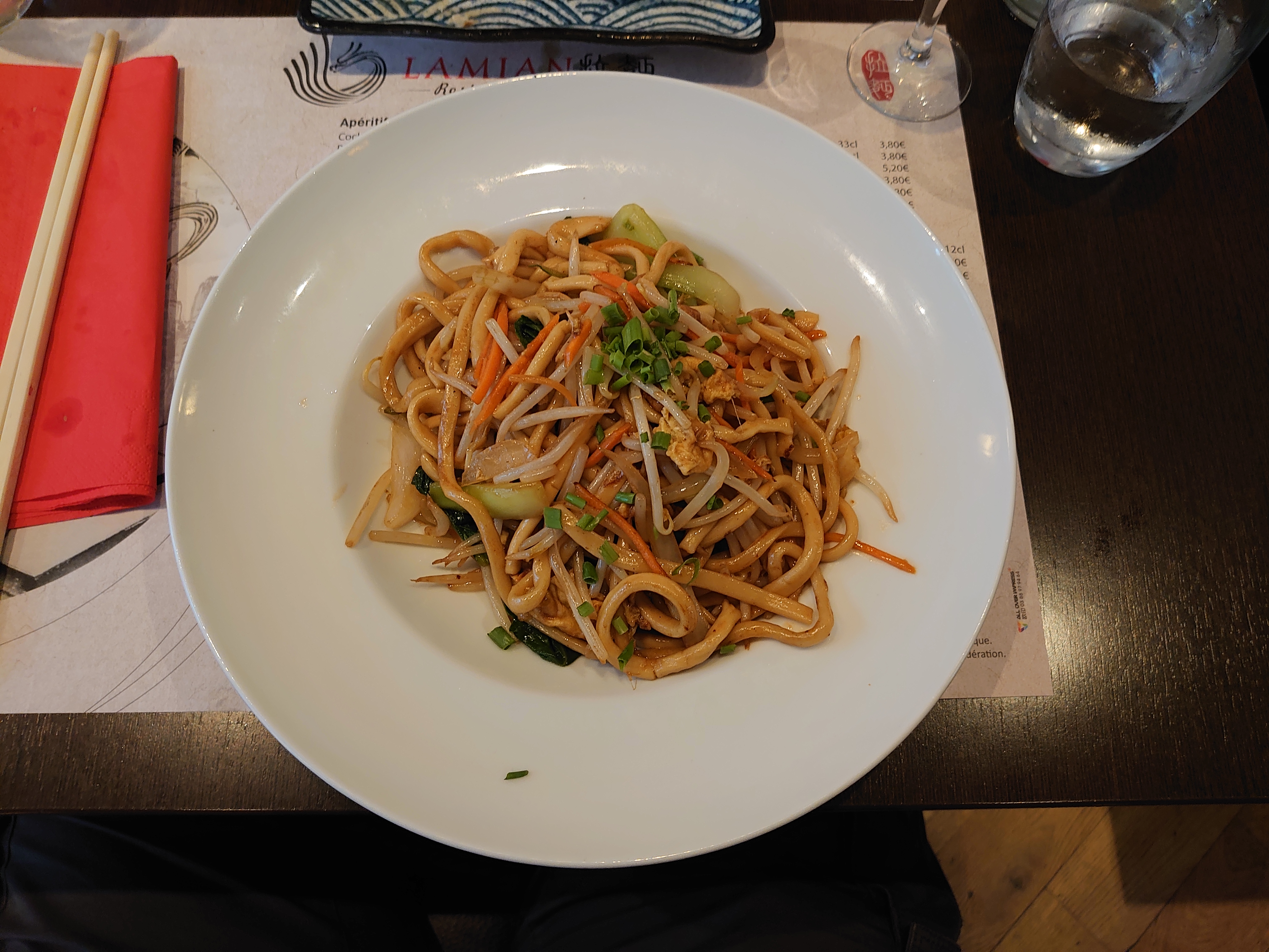 Le plat que nous avons pris (nouilles sautées au légumes) était très savoureux. Les nouilles faites main sur place étaient délicieuses. Petit bémol : dommage qu'il n'y ait qu'une option végétarienne par type de plat: du tofu serait apprécié à la place de la viande/poisson, plutôt que simplement des légumes... Le personnel était très sympathique (serveur très blagueur) ! Un de nos restaurants préférés à Strasbourg !