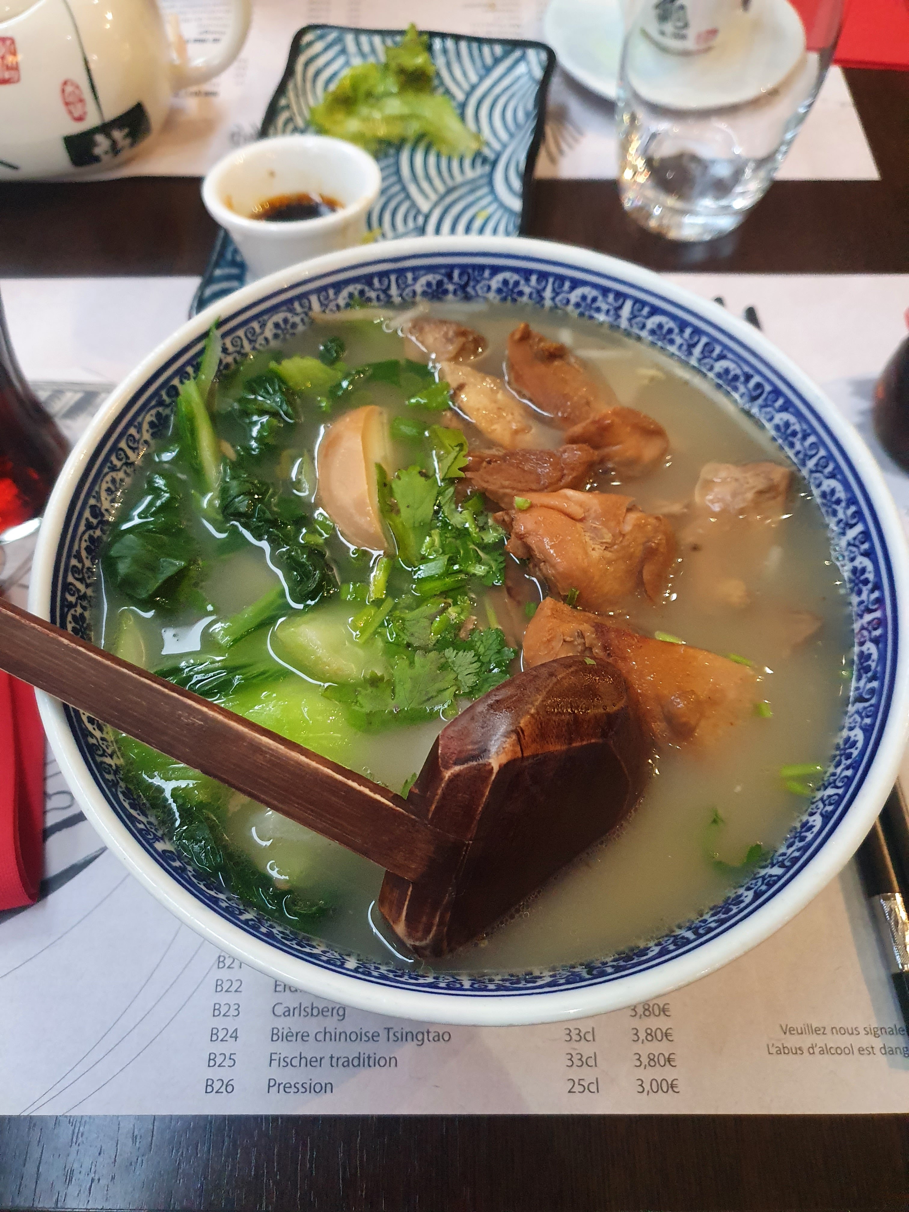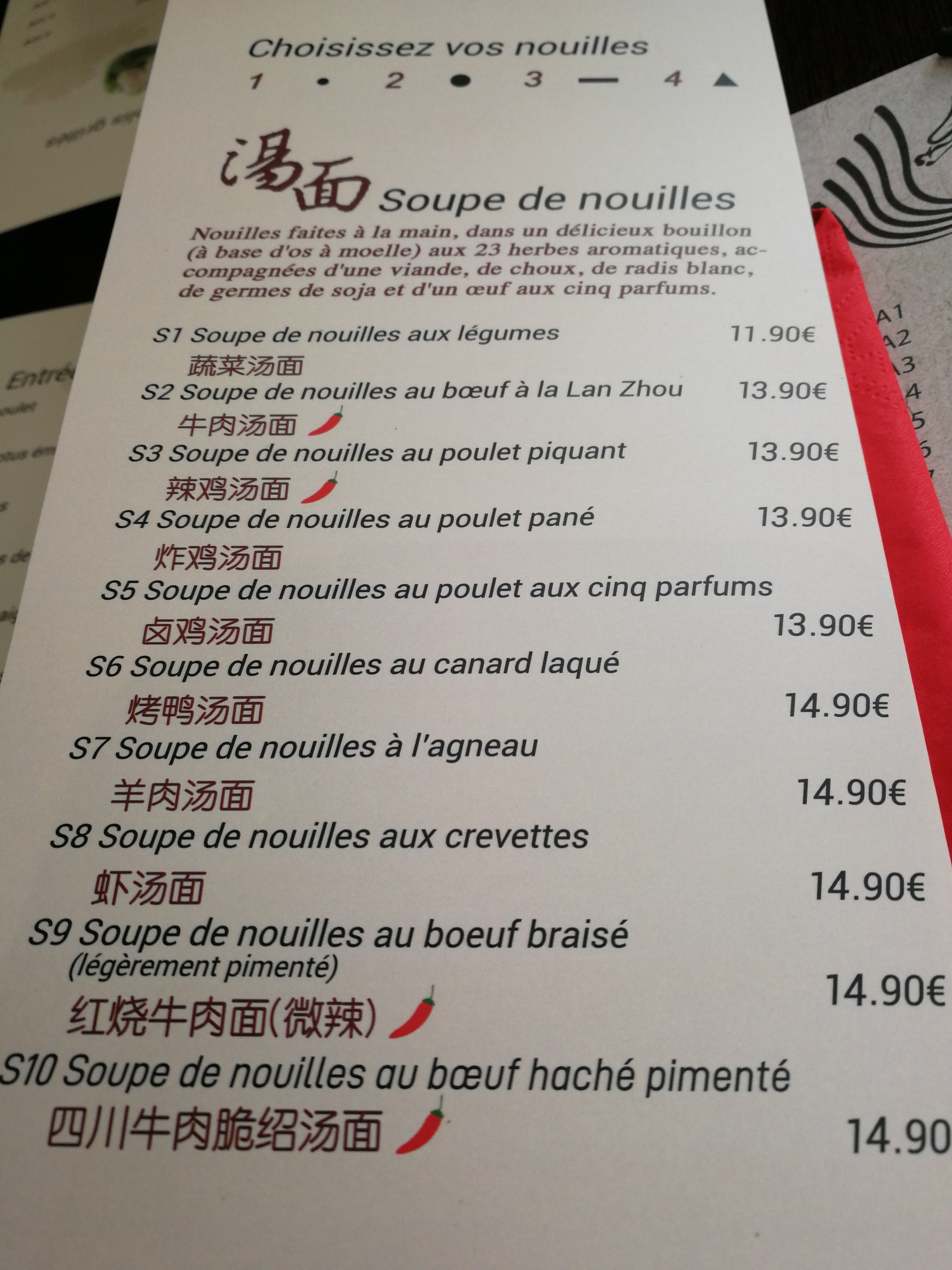 Excellent. Vraiment excellent. Dès que vous passez la porte d’entrée, vous êtes en transe grâce aux odeurs, vous savez tout de suite que ça va être bon. Vous repérez un monsieur en train de faire les nouilles devant vous … Vous vous installez et vous choisissez votre plat. J’ai pris Soupe Poulet Épicée. Pas trop épicée pas trop fade. Parfaite. Le bouillon est une délicieuse tuerie et franchement, la quantité est là ! J’y retournerai sans aucune hésitation … Petit plus : ils prennent les ANCV !