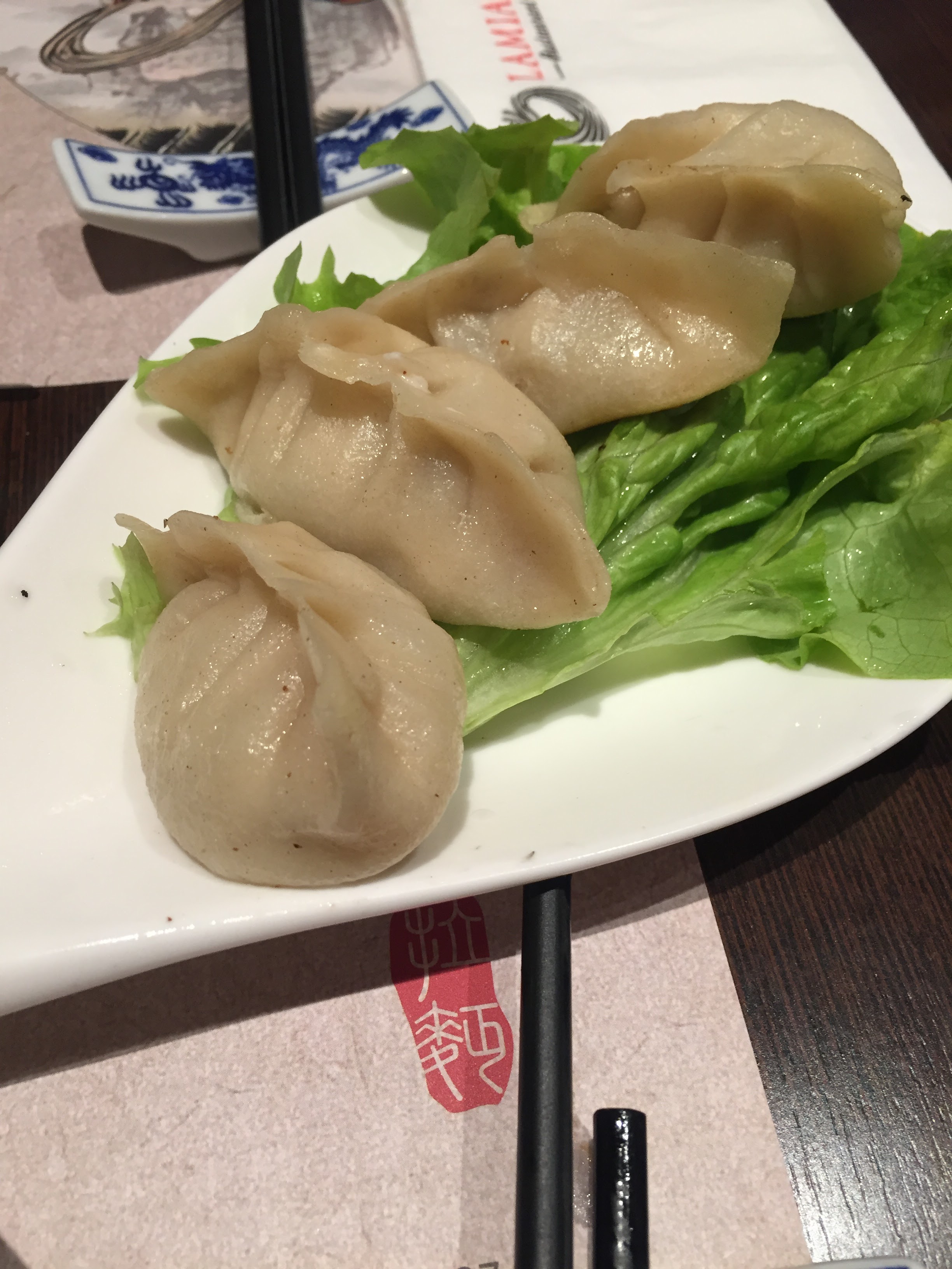Ce qui m'a le plus marqué lors de cette première visite, c'est de voir les nouilles chinoises être tirées par un chef juste derrière une vitre : une très bonne distraction le temps que les plats soient chaleureusement servis. Ce jour-là j'ai commandé des ravioles aux légumes ainsi que des nouilles sautés aux légumes (sauce épicée). L'assiette de nouilles était suffisamment bien remplie pour que je me passe des ravioles la prochaine fois que je viendrai. L’assaisonnement était parfait : je me suis régalée.