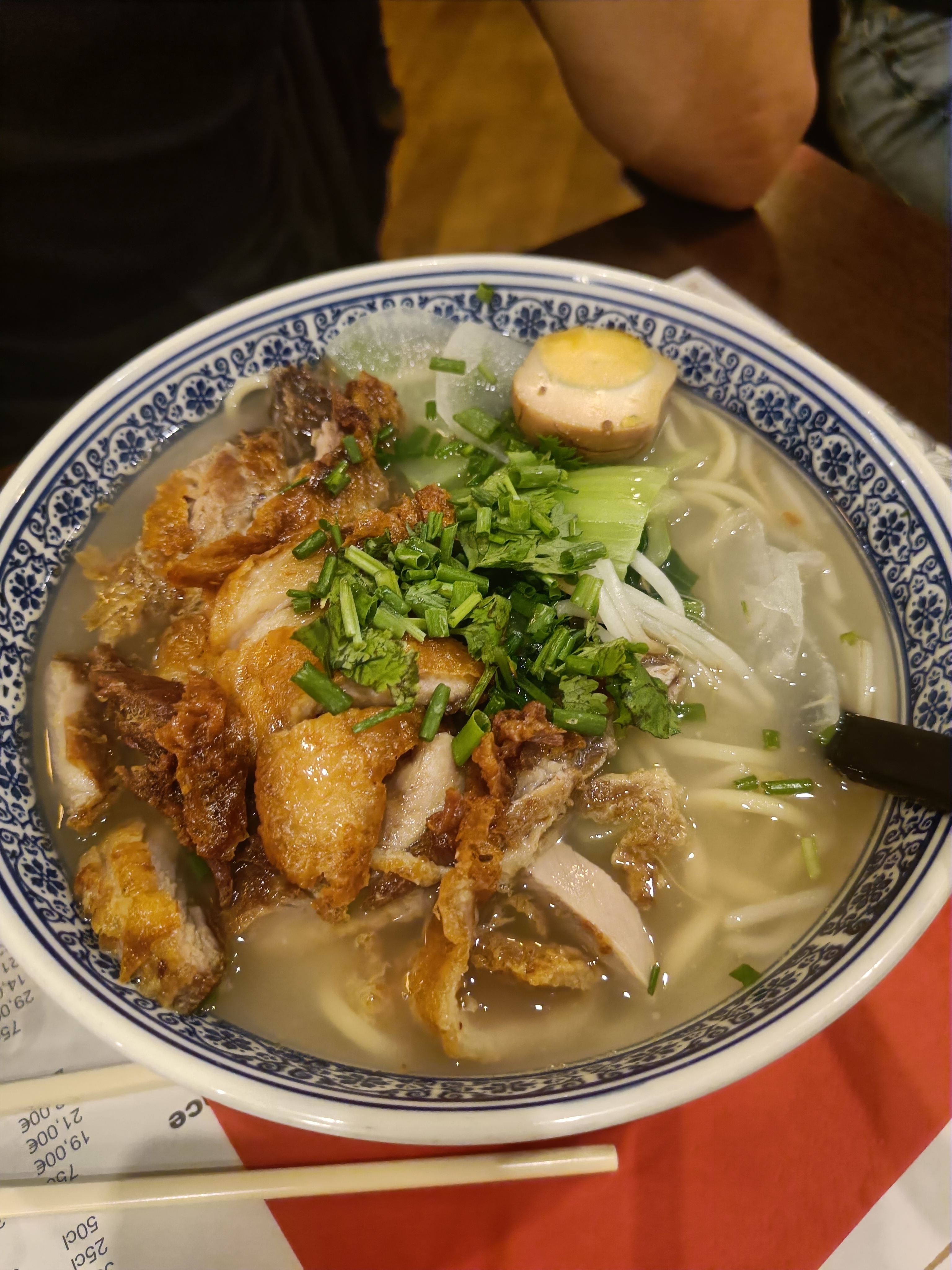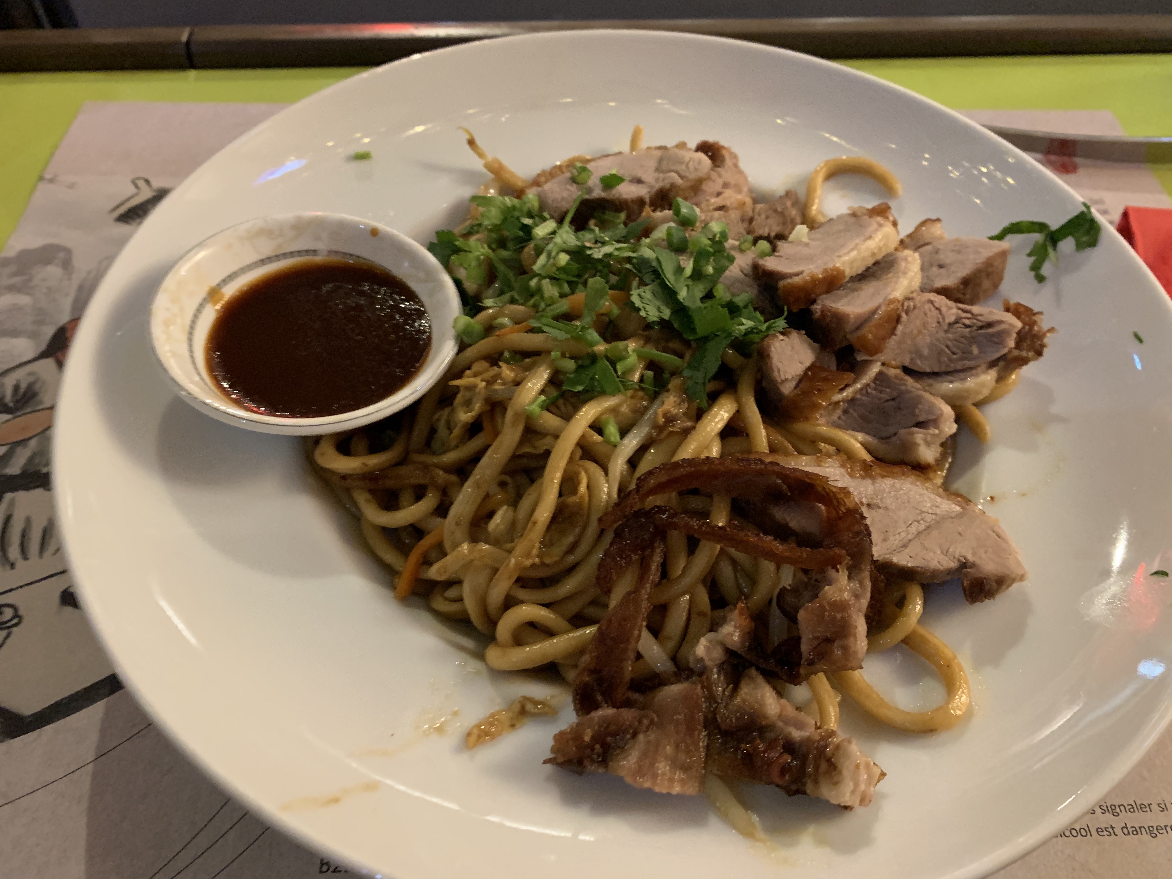 Une cantine chinoise avec une cuisine ouverte, assez bruyante. J’ai pu essayer la soupe de nouilles au poulet 5 saveurs et les nouilles sautées au canard laqué. Ces deux plats sont excellents, généreux en quantité et très savoureux. Les viandes sont bien marinées.