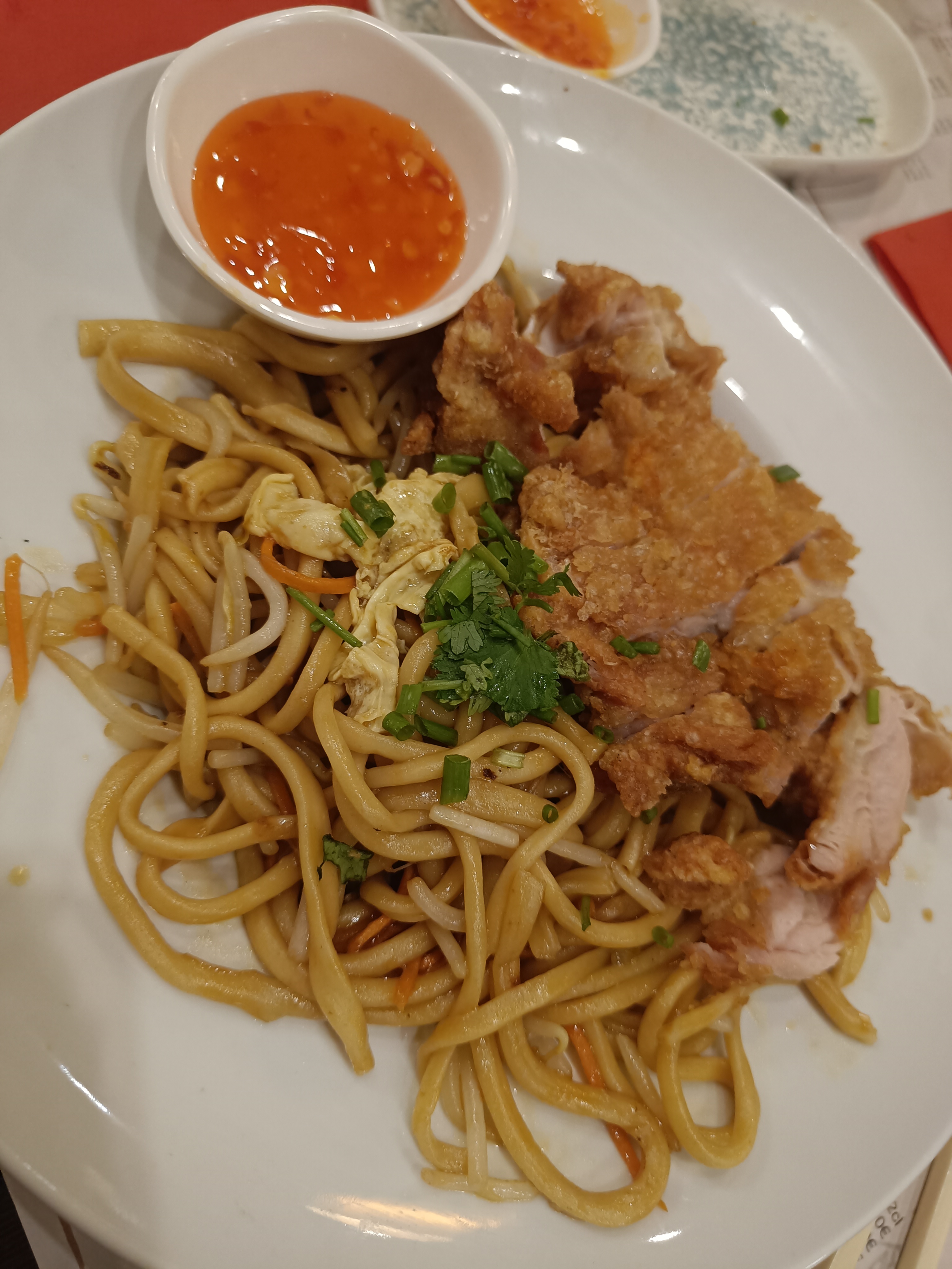 Soupe de nouilles au poulet pané très très bonne, le plat entier est difficile à terminer tellement il est copieux. Les nouilles fraîches préparées sous nos yeux sont délicieuses