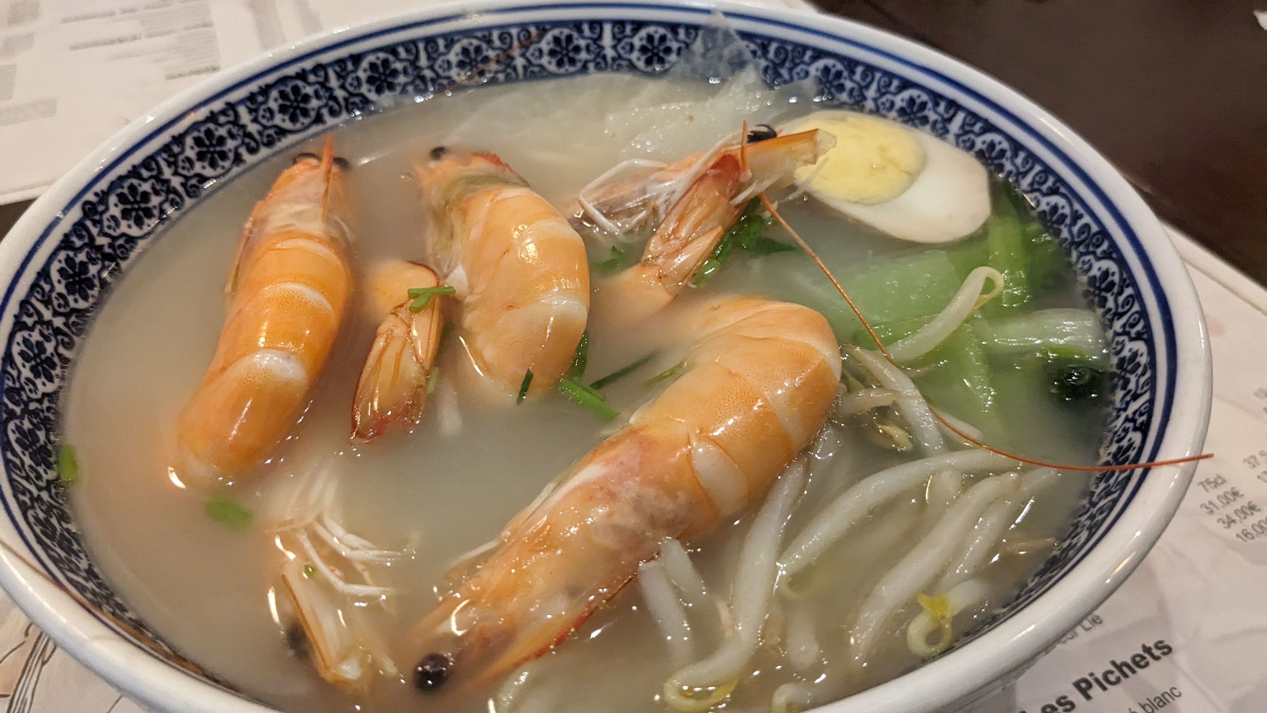 Soupe de Nouilles super bonne ! Les entrées aussi top surtout les raviolis au crevettes omelette.....! Le service était très bien et sympathique ! J’ai vraiment adoré l’eau de coco avec des morceaux de noix de coco ... super délicieux !