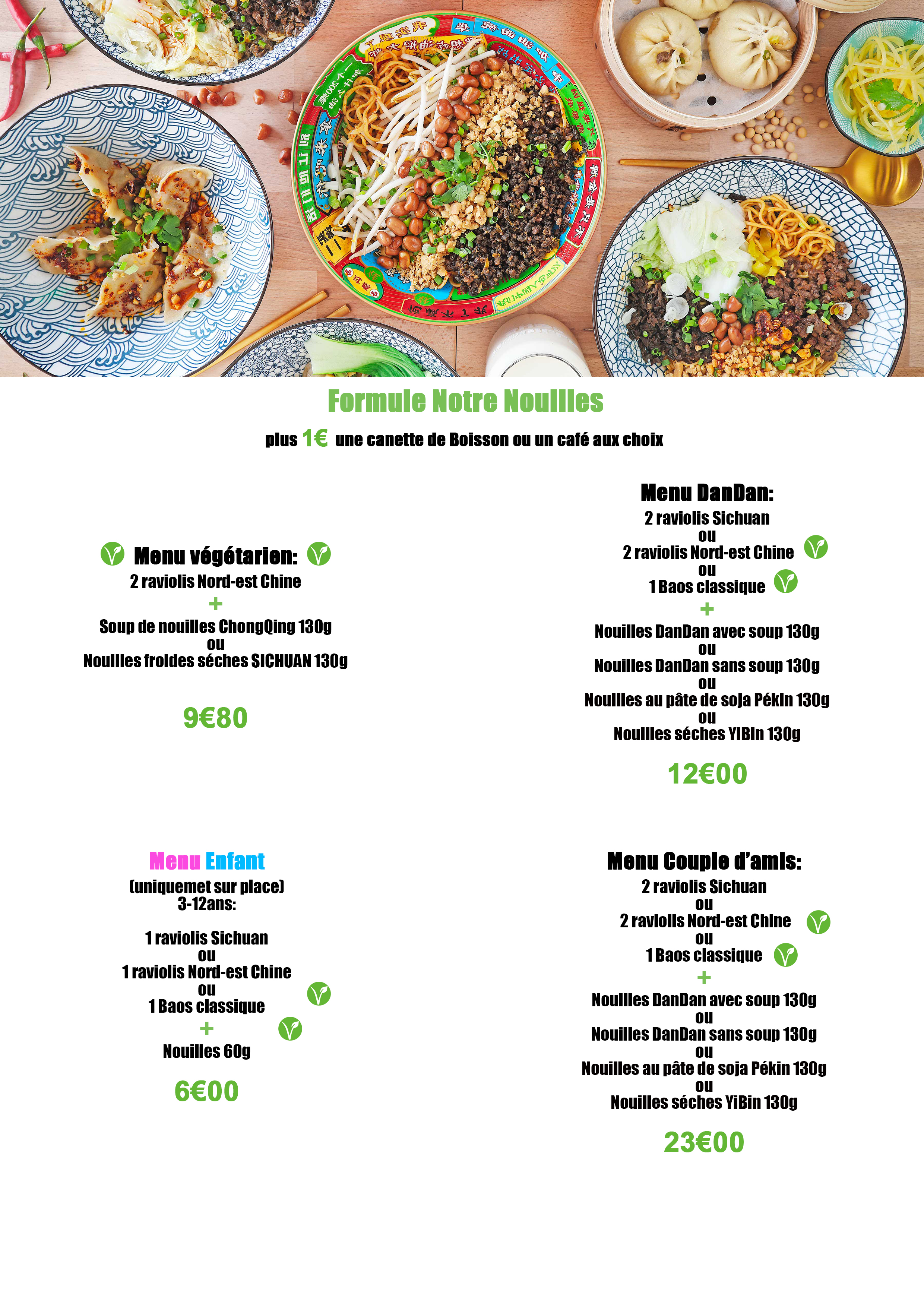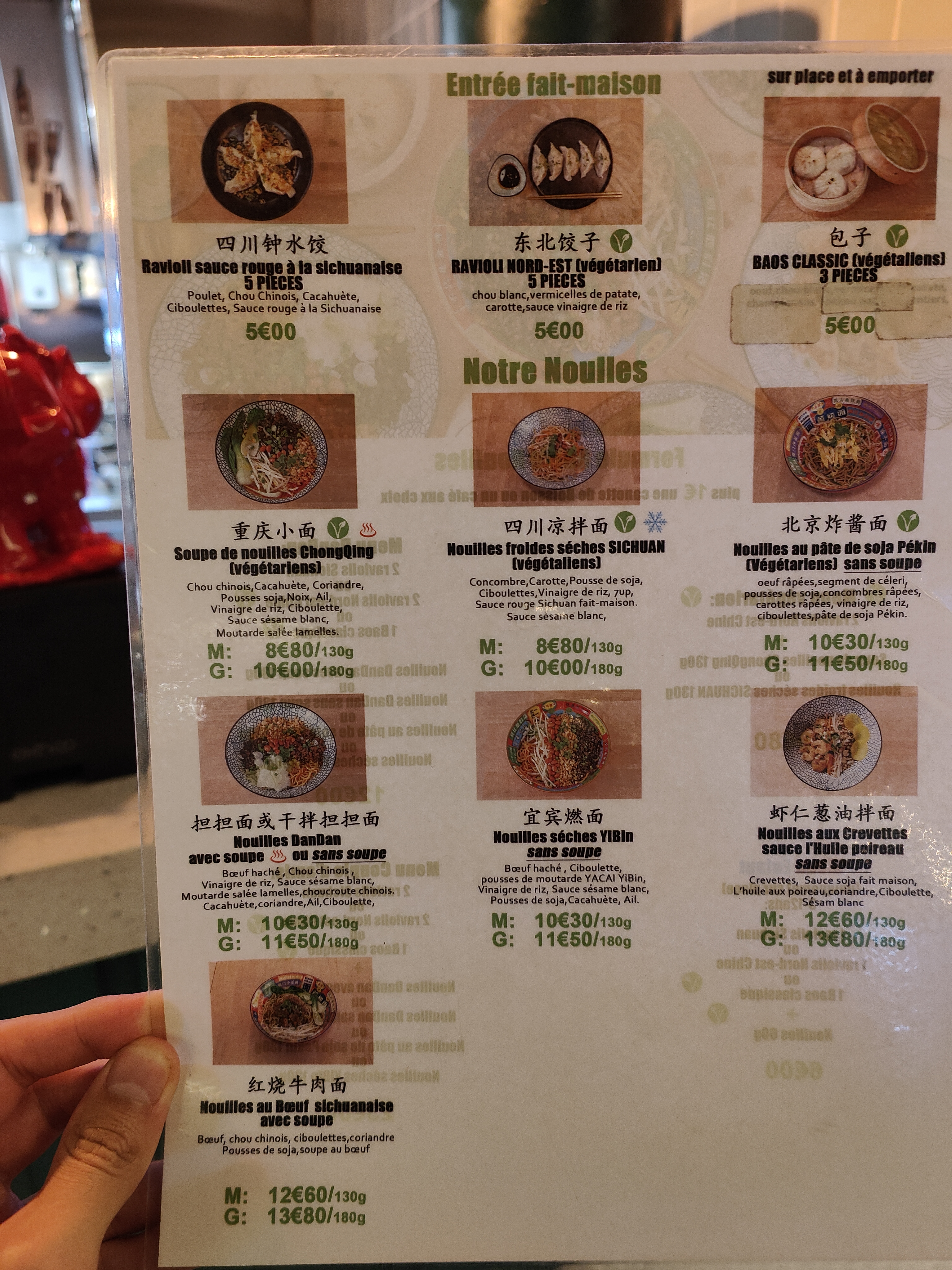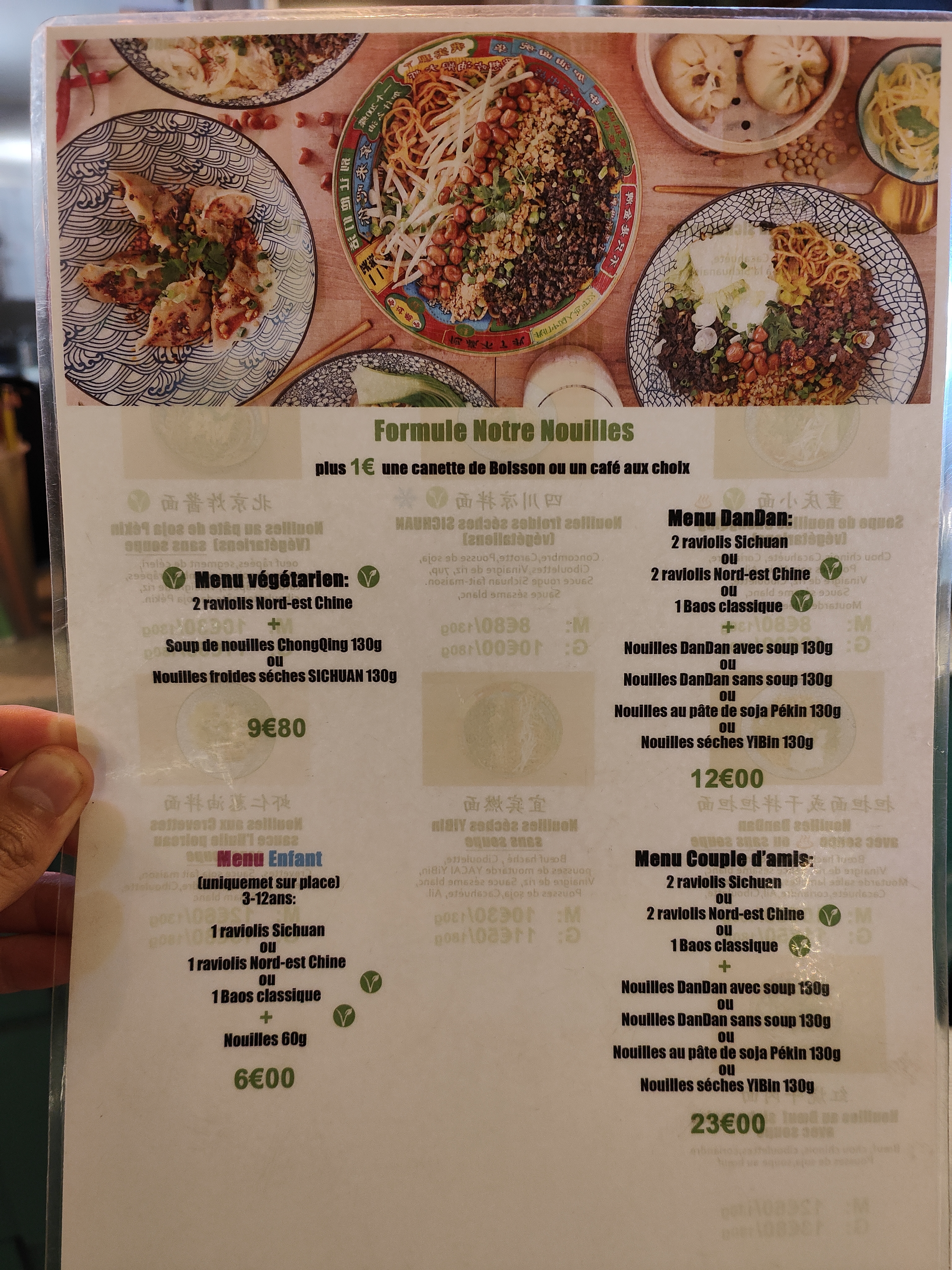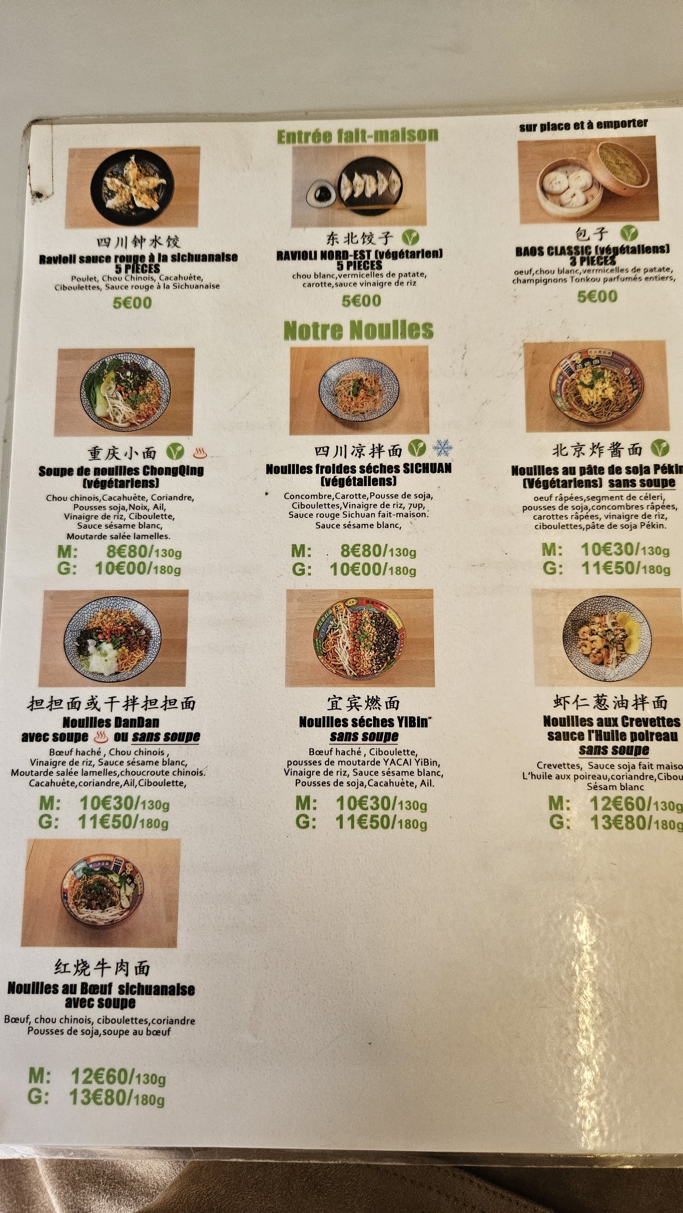 Agréable petite terrasse sur la rue du faubourg Saint-Antoine, un peu à l’écart du va-et-vient des voitures, et qui plus est devant une place de livraison, ce qui évite en soirée de se retrouver avec une voiture garée à moins de 3 mètres de son assiette, comme c’est malheureusement souvent le cas de nos jours. Le restaurant est spécialisé dans les nouilles assaisonnées à la façon de la région du Sichuan, que j’aurais adoré goûter, mais ma femme, dont c’était l’anniversaire, a préféré qu’on mange des raviolis et je me suis régalé avec 6 pièces de raviolis à la Sichuanaise accompagnés de 3 gros Baozi, tous très bien assaisonnés avec des morceau d’herbes aromatiques et de cacahouètes. Ils sont servis dans une sauce placée directement au fond de l’assiette, ce qui est pratique car ça évite d’avoir à les transporter hors de l’assiette pour les tremper dans un ramequin à part, ce qui est à chaque fois une opération périlleuse pour moi dans les restaurants asiatiques qui me fait souvent tacher mes vêtements ou ceux de mes convives, car je maîtrise mal les baguettes. Ici pas de souci, la sauce est déjà dans l’assiette, il n’y a qu’à presser le ravioli dedans avant de le porter à la bouche, et j’ai pu me délecter sans salir personne - heureusement, car je portais des vêtements clairs qui se tachent plus facilement. À noter pour la particularité que le menu est en bilingue français-chinois, ce qui est pratique quand on parle chinois. Il est aussi constitué exclusivement de texte, avec pour chaque plat la liste exhaustive de tous les ingrédients, ce qui change agréablement de tous ces menus criards envahis de photos trompeuses qui provoquent à chaque fois de la déception quand on reçoit le vrai plat dans l’assiette. Ici, comme on n’a que le texte avec la liste de tous les ingrédients, l’esprit peut vagabonder pour se forger sa propre image du plat qu’il va manger, cela stimule l’appétit et l’attrait de la découverte est plus grand quand on reçoit le véritable plat dans l’assiette. Le service est rapide et agréable, on voit que le personnel a à cœur de bien nous servir et nous satisfaire, et qu’il aime le travail sobre et bien fait. Je recommande chaudement, même si je n’ai pas goûté les nouilles, que j’adorerai venir déguster une prochaine fois !